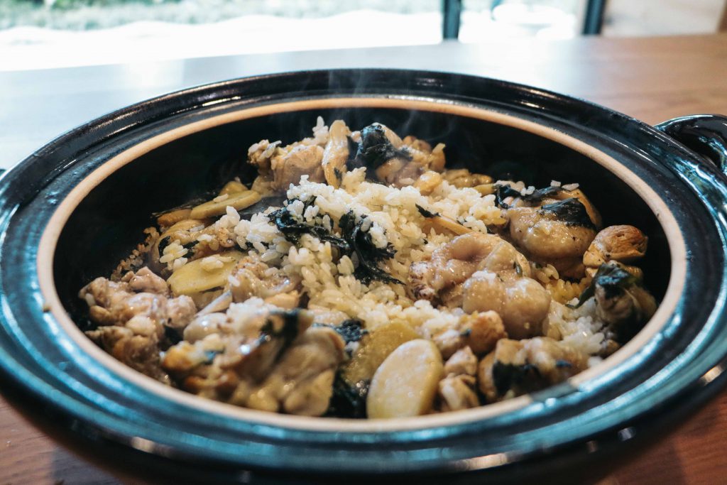 蓋上鍋蓋以大火烹煮,直到土鍋冒出大量水蒸氣,切換成文火直到土鍋收煙至無,關火悶10 分鐘