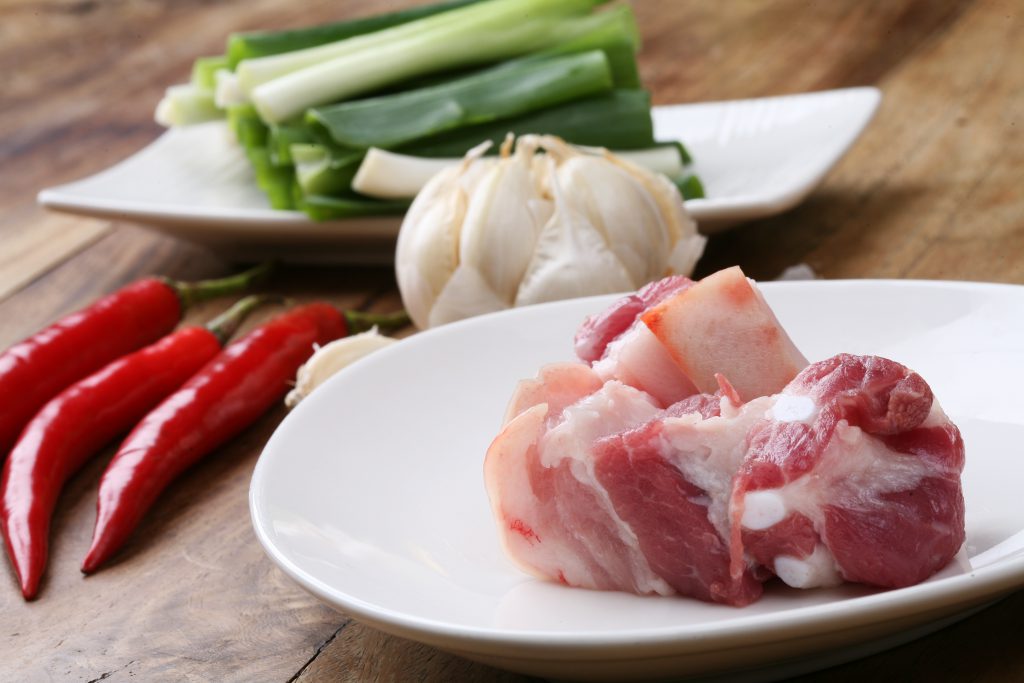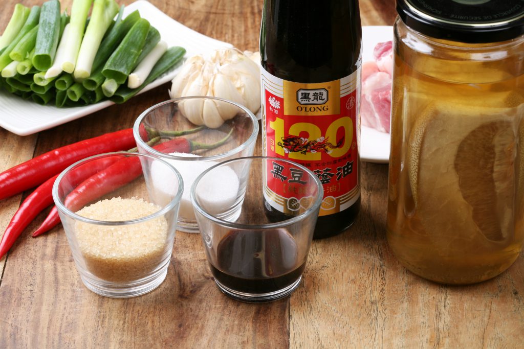 把豬肉放進醬汁裡,加入柚子酒及醬油膏,以及蔥、蒜、辣椒等香料,再將水加滿至淹過豬肉。煮滾後,轉小火滷一小時就完成囉!