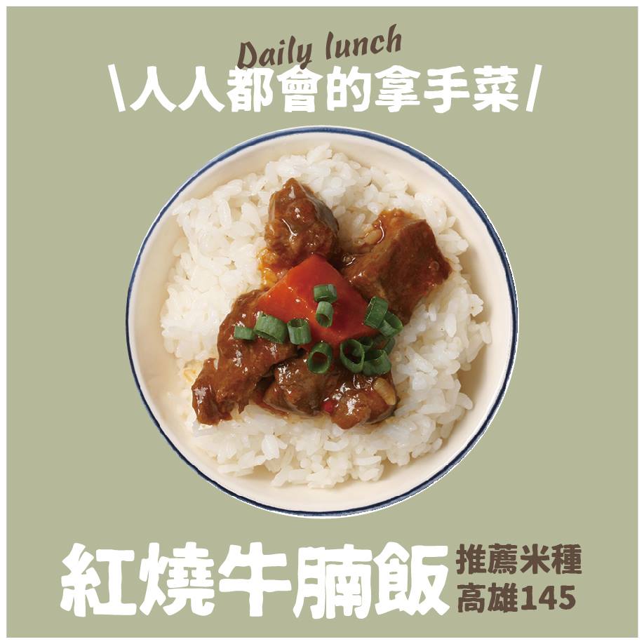 熱騰騰吃最過癮,翠綠的蔥花也不可忘。搭配米粒渾圓的高雄 145 號,淋上濃郁赤紅的醬汁,米飯仍粒粒分明、Q 彈不黏軟!