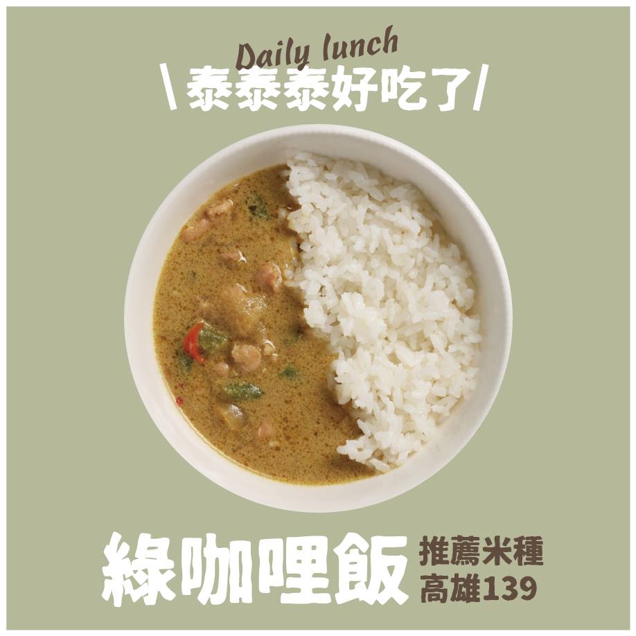 綠咖哩調性辛辣卻不失清爽,常與白肉或海鮮相互搭配,是廚房新手也非常容易上手的料理。米種選用高雄139,淋上綠咖哩的湯汁,米飯依舊飽滿、口感Q黏不糊爛!