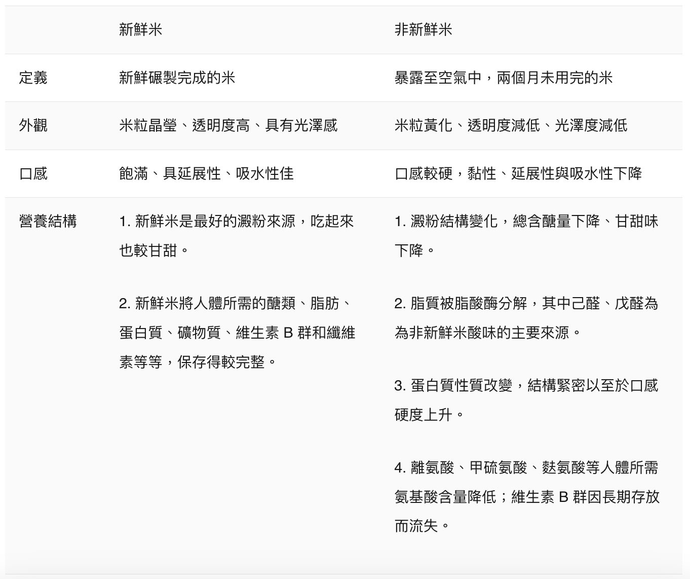 我們首先可以透過下方表格了解新鮮米具體來說為何比較營養、以及更重要的:為何比較好吃?